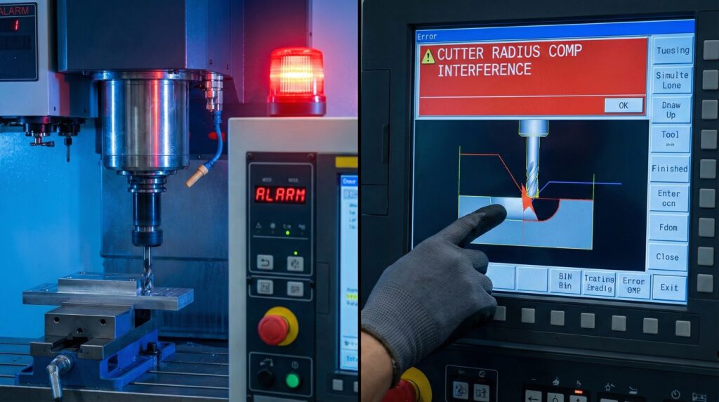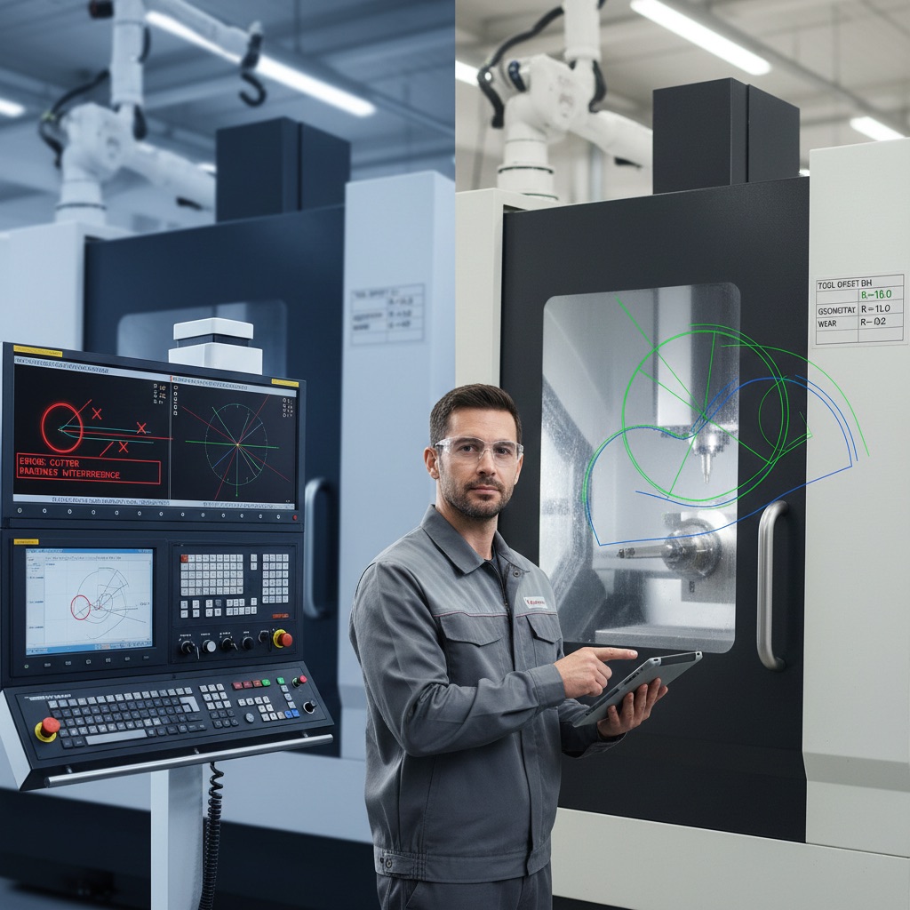Stoisz przy maszynie. Wrzucasz nowy program, naciskasz START i… czerwona lampka. Alarm: „CUTTER RADIUS COMP INTERFERENCE” lub „CRC ERROR”. Znasz to uczucie? Kompensacja promienia narzędzia to jedna z najbardziej przydatnych funkcji w CNC, ale też najczęstsza przyczyna postojów i nerwów operatorów.