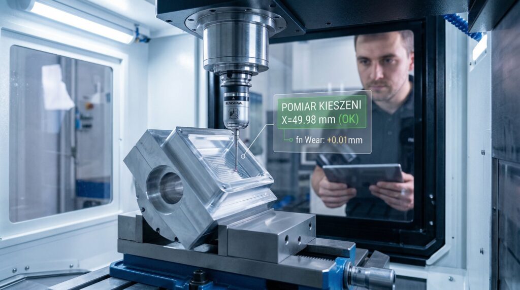 - Automatyzacja (In-Process Inspection): Sonda nie tylko bazuje detal. Może sprawdzić, czy wyfrezowana kieszeń trzyma wymiar, zanim wyciągniesz detal z imadła.