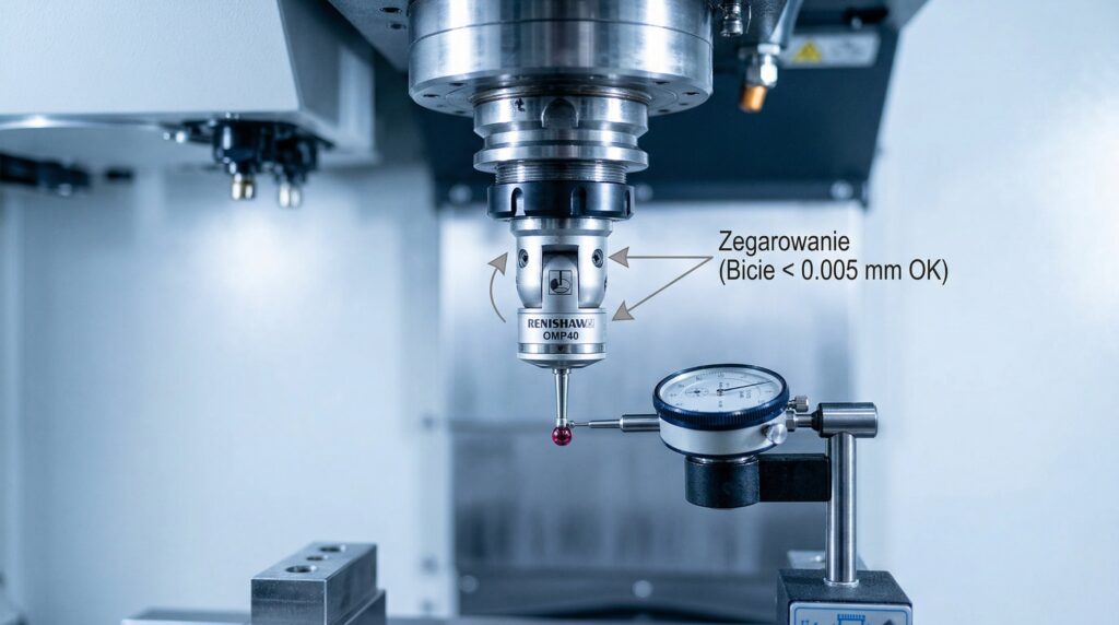 - Jeśli zegar pokazuje bicie (np. 0.05 mm), używasz małych śrub regulacyjnych na korpusie sondy (system „push-pull”), aby ustawić bicie poniżej 0.005 mm (5 mikronów). Jeśli tego nie zrobisz, maszyna będzie kłamać przy pomiarze każdego otworu!